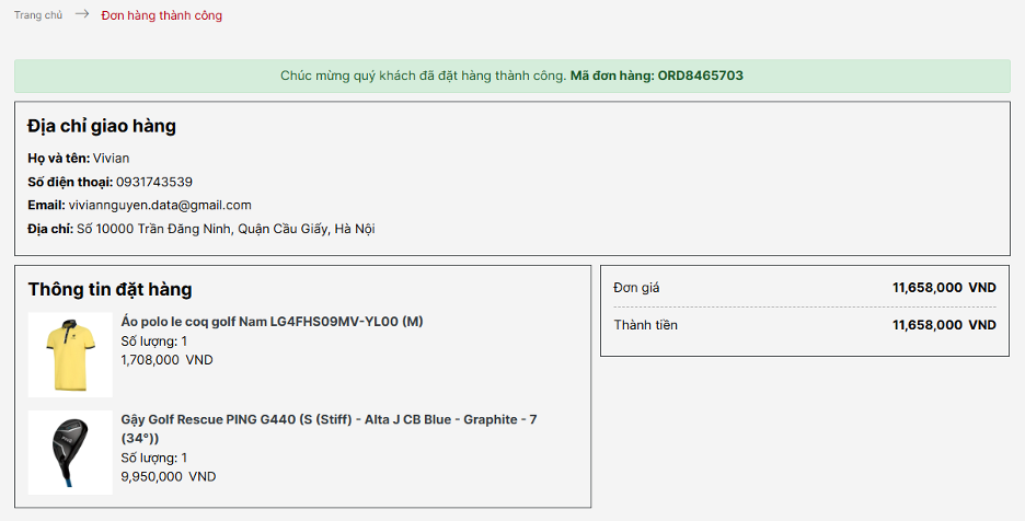 Bước 5: Sau khi bấm “Thanh toán ngay”, đơn hàng của quý khách sẽ được xác nhận khi giao diện hiện lên như sau
