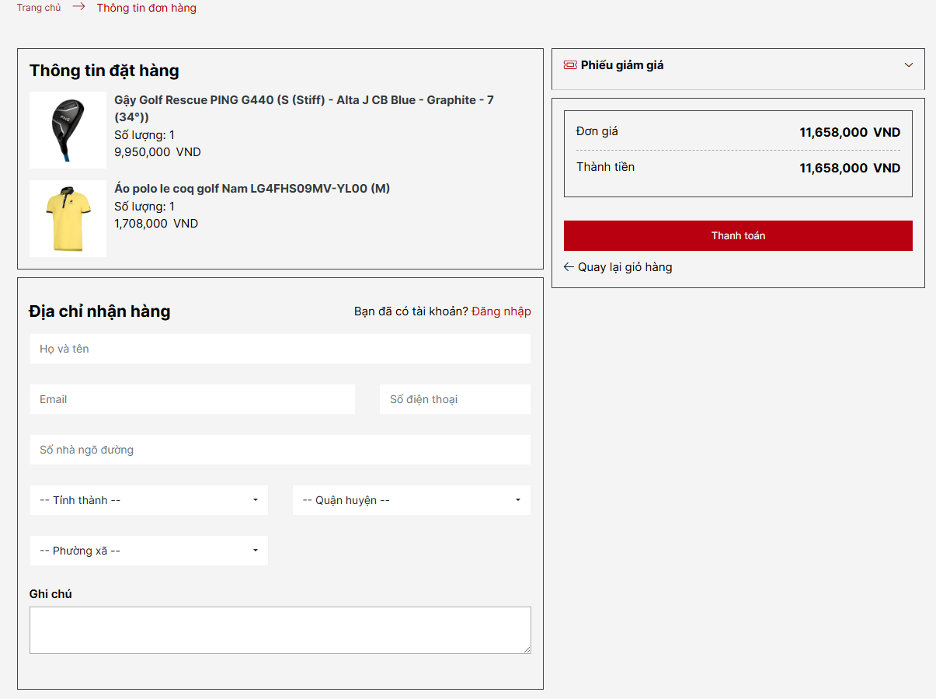 Để mua sắm trên website Alphagolf.vn, người dùng có thể thực hiện đăng ký tạo tài khoản hoặc đăng nhập nếu đã có tài khoản